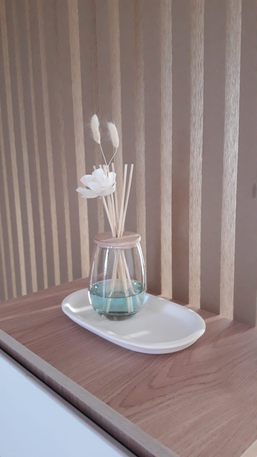 Su diseño moderno y orgánico, con un envase de vidrio bombé que captura y refleja la luz, se fusiona con la calidez de su tapa difusora de madera maciza. Cada detalle ha sido pensado para deleitar tu vista y tu tacto, convirtiéndolo en una pieza central que embellece tu entorno. Las varillas de madera ratán de 23 cm son el conducto perfecto para que tus fragancias favoritas se expandan con elegancia y persistencia.