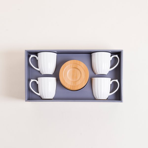 SET X 4 TAZAS DE PORCELANA BLANCA RAYADAS PLATO DE BAMBOO 160ML